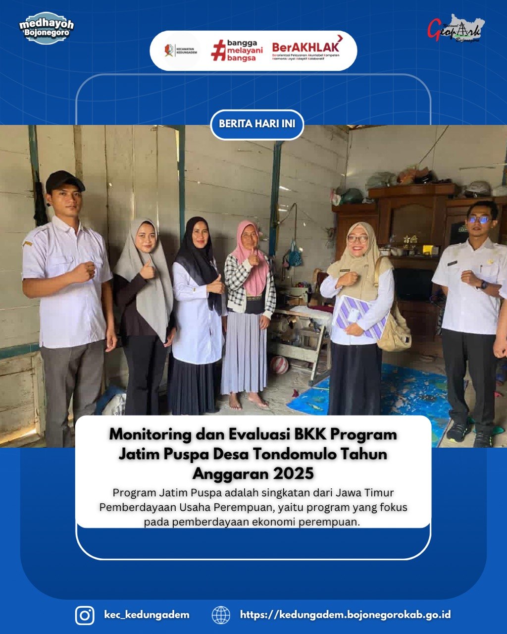 Monitoring dan Evaluasi BKK Program Jatim Puspa TA 2025 di Desa Tondomulo dilaksanakan sebagai upaya memastikan bantuan tepat sasaran dan memberikan dampak nyata bagi pemberdayaan ekonomi perempuan. Melalui kegiatan ini, terdapat 30 KPM (Keluarga Penerima Manfaat) yang dilakukan sampling monitoring dan evaluasi oleh Dinas Pemberdayaan Masyarakat dan Desa Kabupaten Bojonegoro kepada 3 KPM yang selanjutkan ada peninjauan langsung terhadap pemanfaatan bantuan serta perkembangan usaha para penerima manfaat.